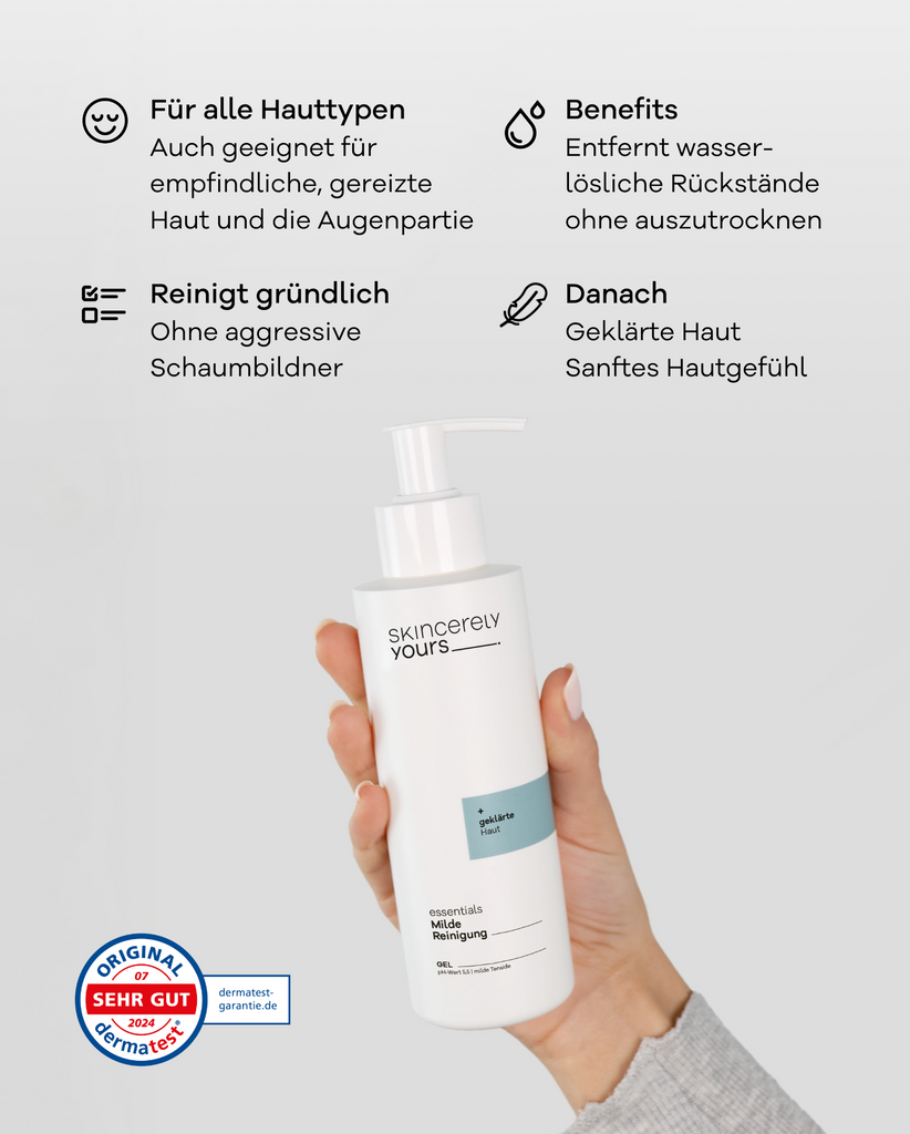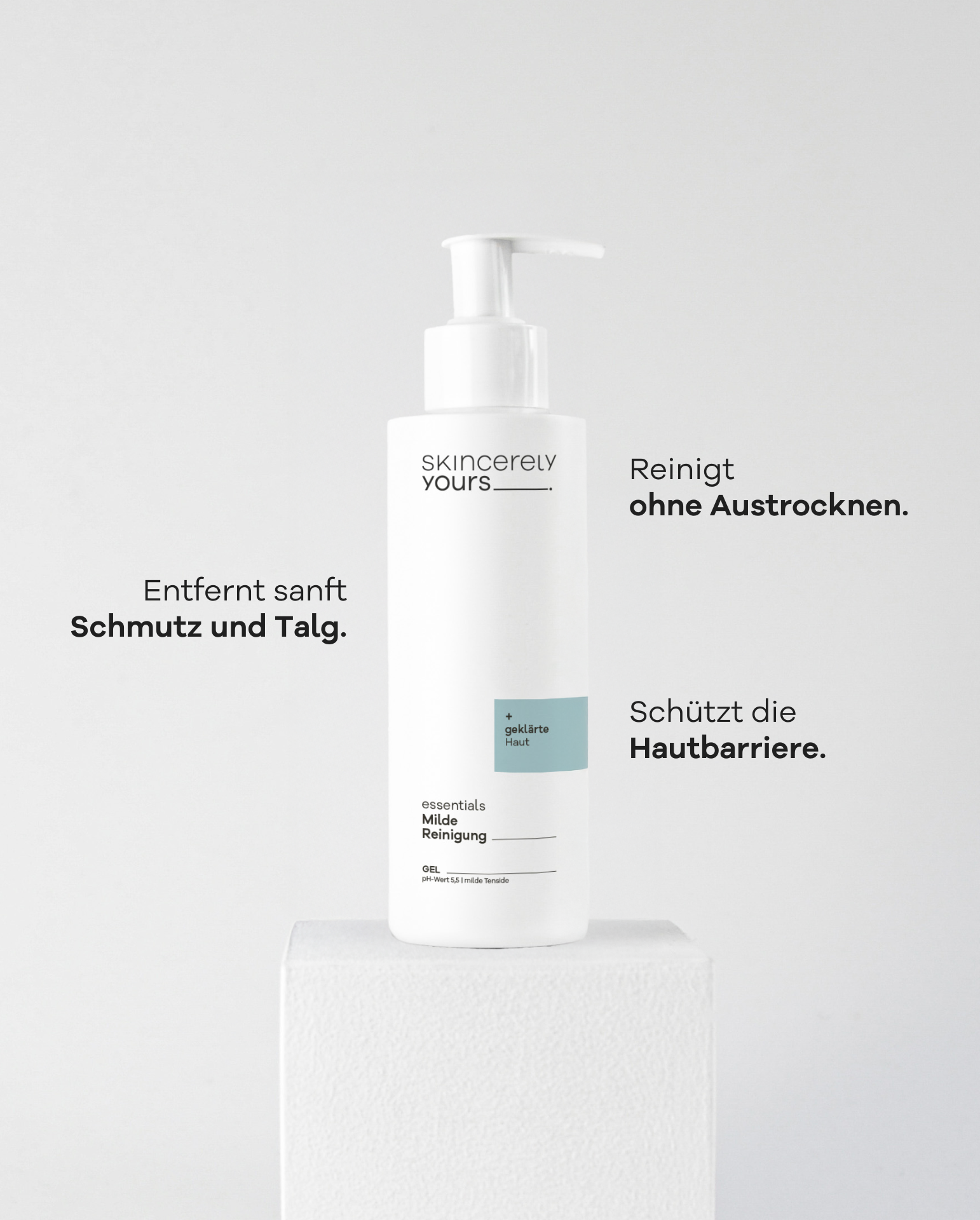 Unsere Milde Reinigung ist ein sanftes, wasserbasiertes Reinigungsgel, das deine Haut gründlich von Schmutz, Talg, Schweiß, Make-up & Co. befreit, ohne ihr Feuchtigkeit oder wichtige Fette zu entziehen oder ihre natürliche Schutzbarriere zu stören.