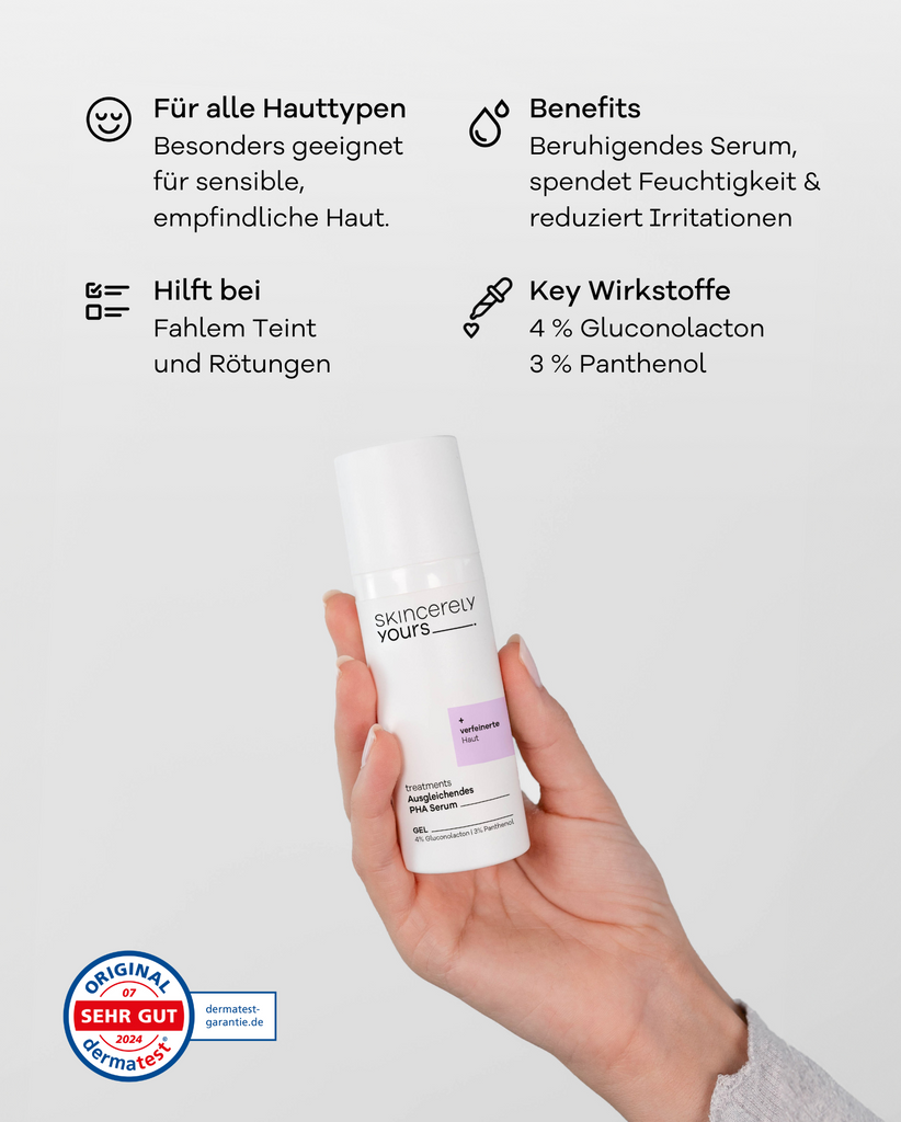 Unser Ausgleichendes PHA Serum bietet dir eine 2-in-1 Lösung: Peeling & Pflege gleichzeitig! Es ist ein super sanftes Peeling, das selbst für die empfindlichste Haut, die zu Rötungen neigt, bestens geeignet ist.