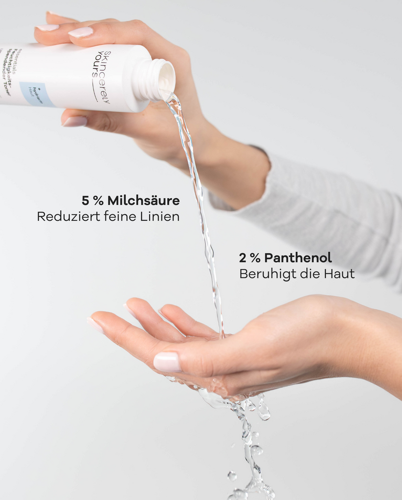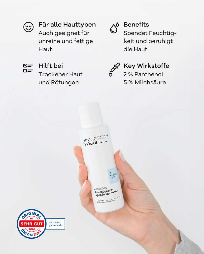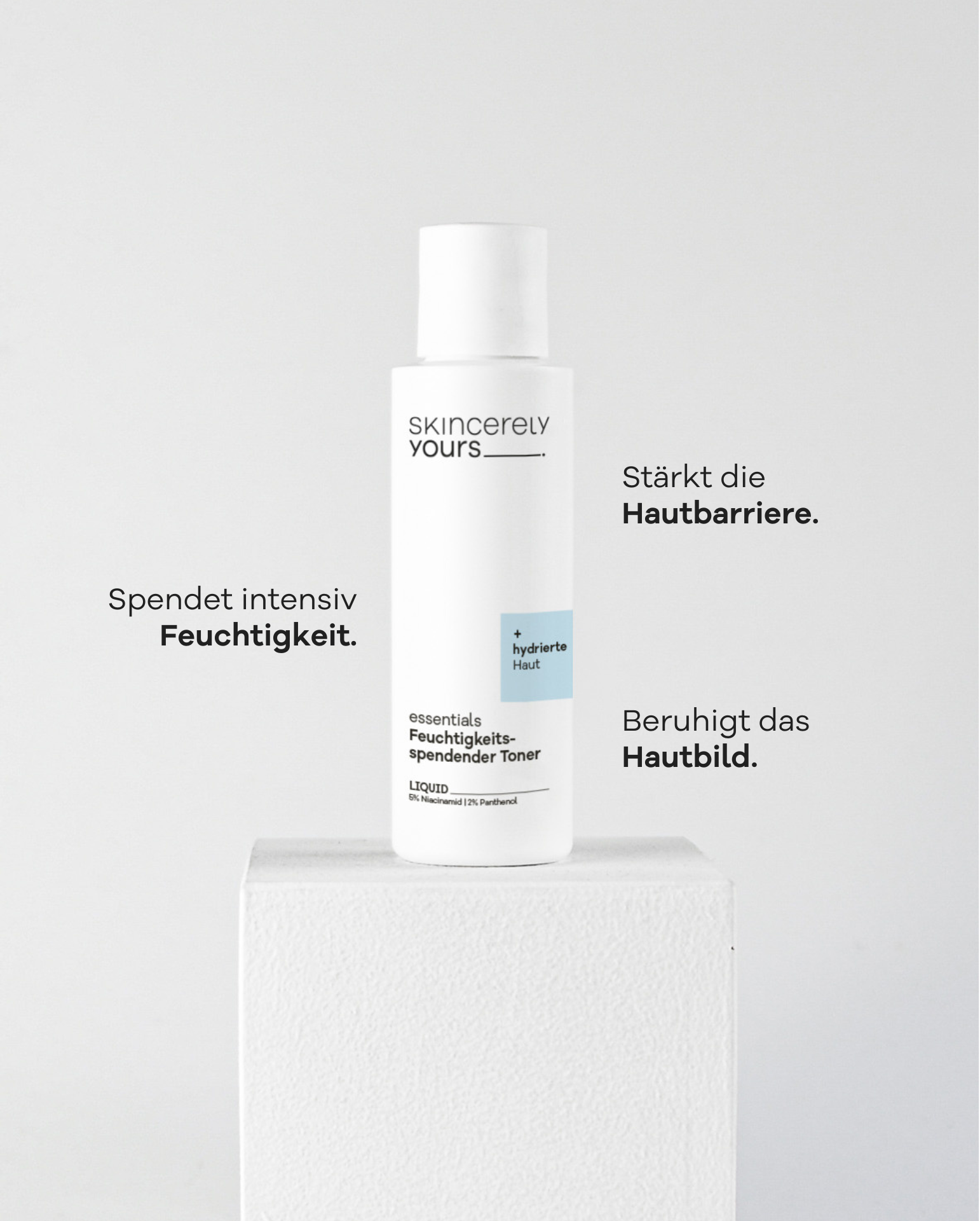 Mit unserem Feuchtigkeitsspendenden Toner bekommst du einen extra Step in deiner Hautpflegeroutine, der deine Haut intensiv hydratisiert, Hautirritationen reduziert und ihr ein gesundes Strahlen verleiht. Er ist ein wahres Multi-Talent: er gleicht die Haut nach der Reinigung aus, stärkt die Hautbarriere und hinterlässt ein seidig-weiches Hautgefühl.