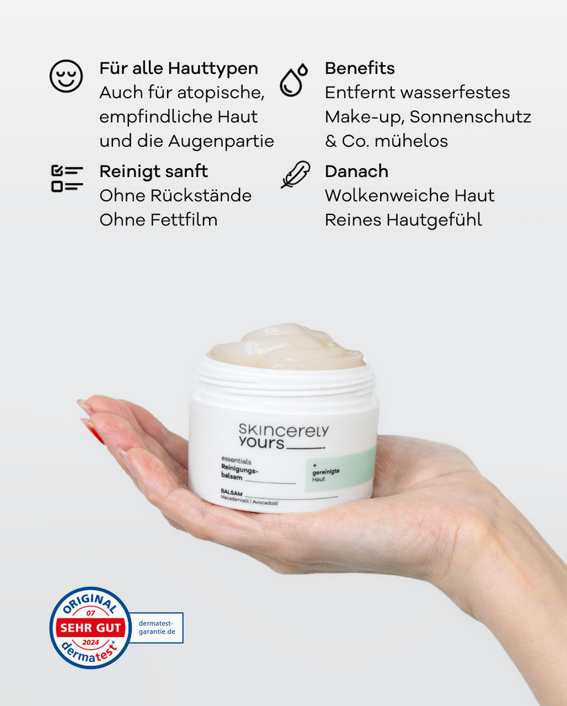 Unser ultra-sanfter, aber wirkungsvoller Reinigungsbalsam zeichnet sich durch seine reichhaltige, balmartige Textur aus, die beim Auftragen zart schmilzt und sich in eine seidige Emulsion verwandelt.